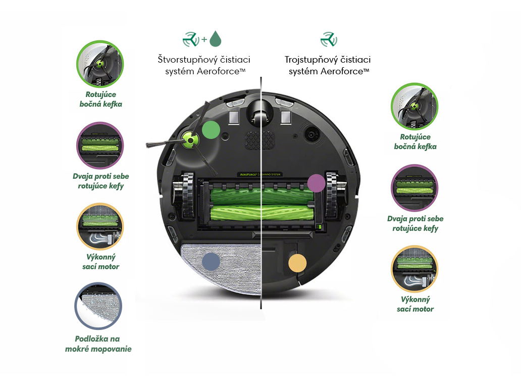 iRobot Roomba je vybavená patentovaným trojstupňovým čistiacim systémom AeroForce. Bočnú kefku namete špinu spoza rohov, zvyšok uvoľní a zoberú gumové kefy az nich sa všetko do zberného koša prenesie vďaka silnému podtlaku.